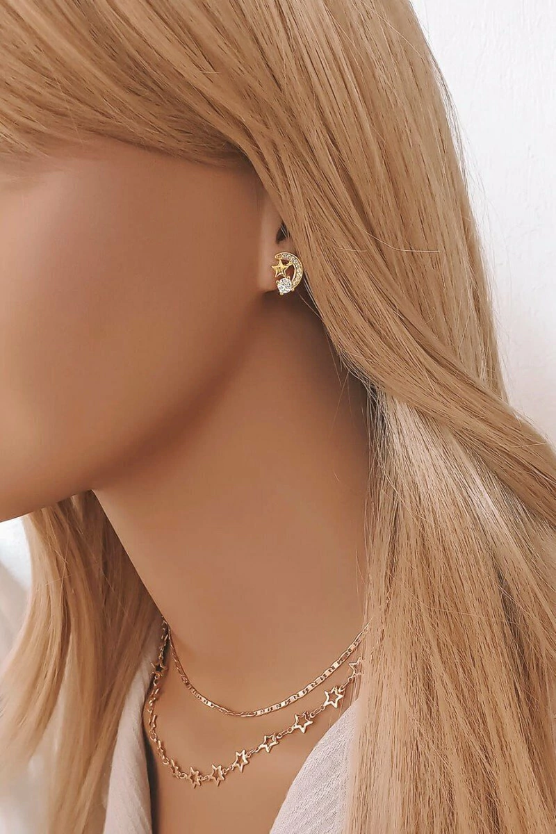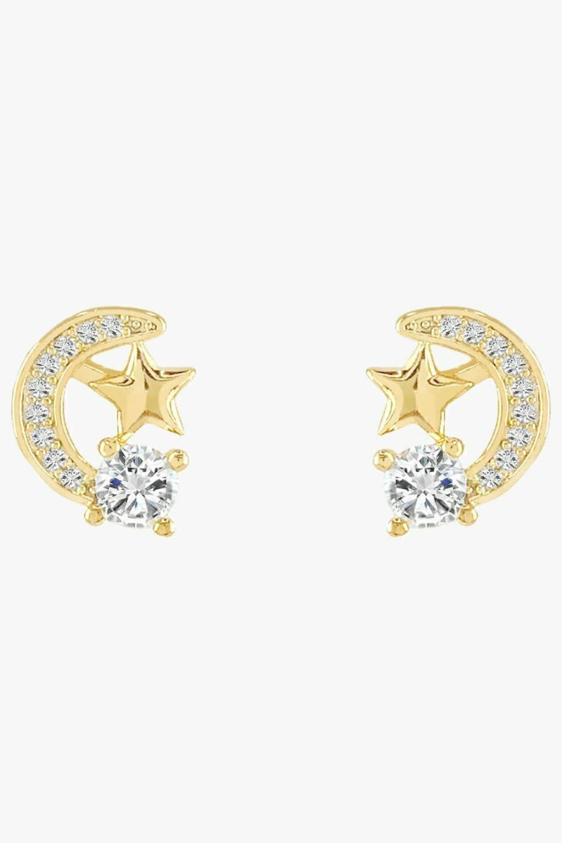 Este brinco pequeno folheado, pequeno em formato de lua com aplicações de mini zircônias cristais, estrela e um ponto de luz também em zircônia. Uma peça sofisticada e delicada. Acompanha par de tarraxa ideal para o modelo.
