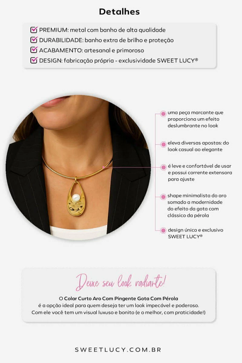 Se existe um tipo de acessório que muda o jogo — sem exageros, só com presença, podemos afirmar que é o Colar Curto Aro Com Pingente Gota Com Pérola da SWEET LUCY®. Ele ilumina, valoriza a pele, o look e traz uma sofisticação bonita ao visual. É a opção perfeita para mulheres que amam acessórios com aquela presença elegante adicionado a um toque do brilho dourado (que ... cá entre nós , vai transformar qualquer look seu, em instante!).