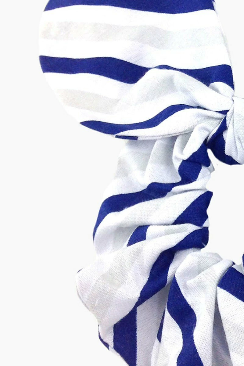 O modelo SWEET LUCY é composto por elástico revestido em tecido de algodão com estampa listrada em branco, azul marinho e cinza.